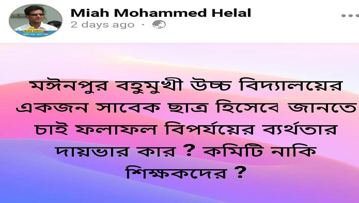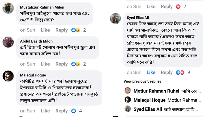 এসএসসি পরীক্ষার ফলপ্রকাশের পর মঈনপুর বহুমুখী উচ্চ বিদ্যালয়ের ফলাফল বিপর্যয় নিয়ে সামাজিক মাধ্যমে চলছে ব্যাপক আলোচনা-সমালোচনা।