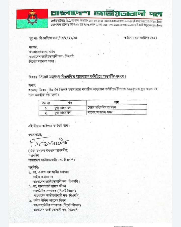 ৫ অক্টোবর বিএনপি’র মহাসচিব মির্জা ফখরুল ইসলাম আলমগীর স্বাক্ষরিত এক পত্রে এ অন্তর্ভূক্তির ঘোষণা দেয়া হয়।