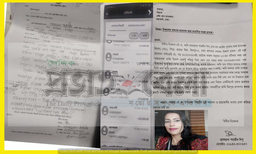 মীরপুরের রুপনগর থানায় নারী সমাজকর্মী দীপুর করা জিডি নং-৭৪৭ তাং ১৮/১০/২০। জিডি ও বিকাশ কর্তৃপক্ষকে করা আবেদনে দীপু উল্লেখ করেছেন যে ৪টি নাম্বার থেকে তার ৬০ হাজার টাকা হাতিয়ে নেয়া হয়েছে। নাম্বাগুলো হচ্ছে, ০১৮৮২৯৯৯৪৪২ নাম্বারে ১০ হাজার টাকা, ০১৭৮৪৮৩৯০৫৬ নাম্বারে ৪৯৯৯ ও ৫হাজার টাকা, ০১৭৭১১৬৩৪৮৮ নাম্বারে ১৫ হাজার টাকা এবং ০১৮২০৫২০৯৫৭ নাম্বারে ২০হাজার টাকা হাতিয়ে নেয়া হয়েছে। তা বিকাশ কর্তৃপক্ষের আয়ত্বে বাইরে নয়।