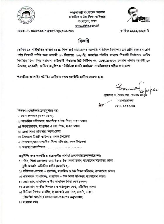 বিজ্ঞপ্তিতে বলা হয়েছে, কোভিড-১৯ পরিস্থিতির কারণে ২০২১ শিক্ষাবর্ষে সারাদেশের সরকারি মাধ্যমিক বিদ্যালয়ে ১ম শ্রেণি হতে ৯ম শ্রেণি পর্যন্ত শিক্ষার্থী ভর্তির জন্য আগামী ৩০ ডিসেম্বর ২০২০ অনলাইন লটারির মাধ্যমে শিক্ষার্থী নির্বাচনের তারিখ নির্ধারিত ছিল। কিন্তু হাইকোর্ট বিভাগের রিট পিটিশন চলমান থাকায় আগামী ৩০ ডিসেম্বর অনুষ্ঠিতব্য ‘ডিজিটাল লটারি কার্যক্রম’ সাময়িকভাবে স্থগিত করা হল।