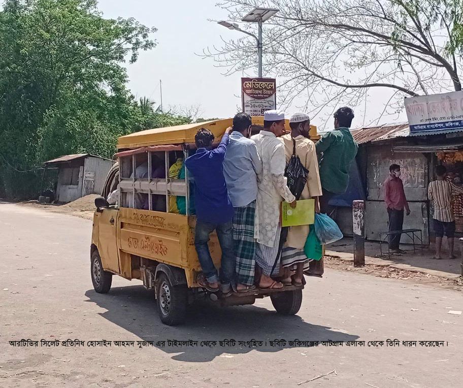 জকিগঞ্জে ঝুকি নিয়ে চলছে কিছু গণপরিবহণ। টাসাটাসি করে আরোহন করছে যাত্রীরা।